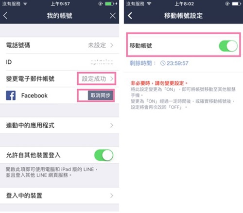 1.line 確定有綁定信箱以及電話號碼或是Facebook(2選一) 再開啟移動帳號 (重要)