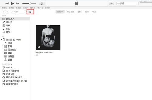 3.手機透過傳輸線連接電腦開啟iTunes,正確連接後 會出現一個手機的符號,點進去
