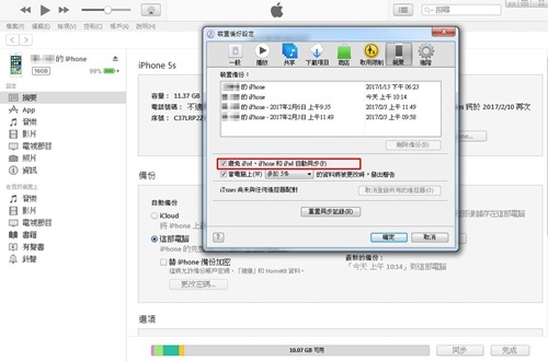 「避免iPod、iPhone和iPad自動同步」打勾,目的是不要讓手機跟電腦一接上就同步