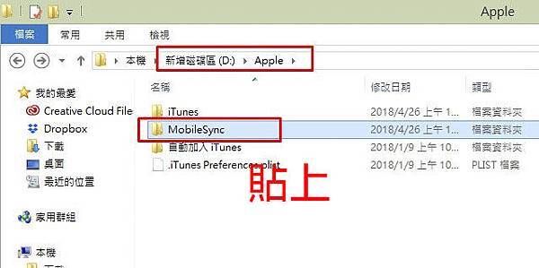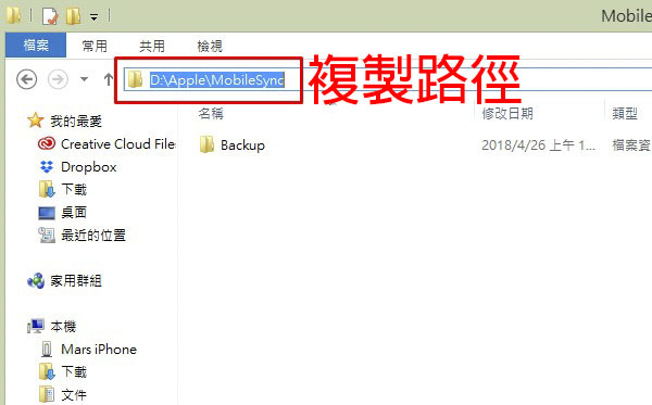 4.例如我是 搬到 D:\Apple\MobileSync (建議直接打開這資料夾後複製路徑)