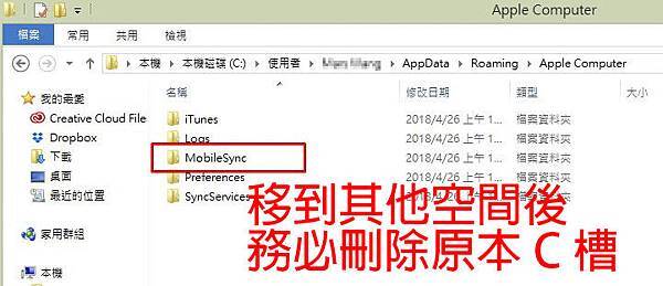 5.然再回去 原本C槽的 刪除MobileSync "務必要刪除原本路徑"